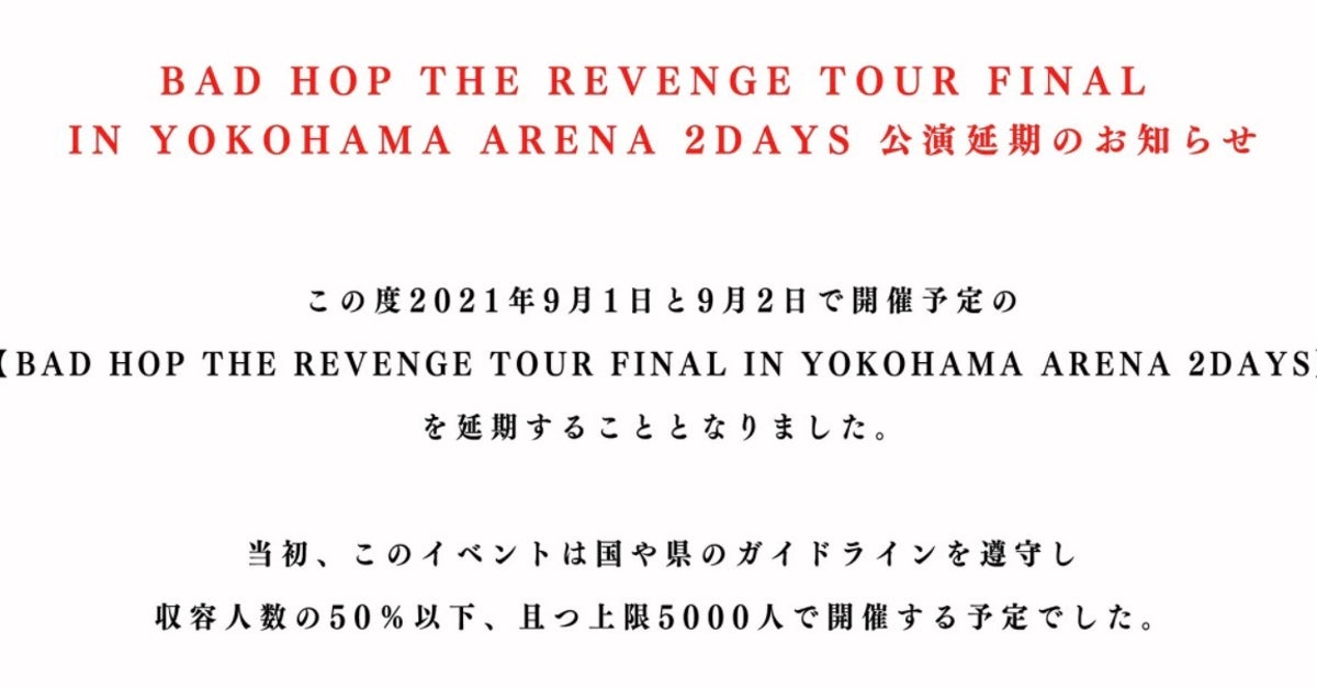 この度9月1日と9月2日で開催予定のBAD HOP THE REVENGE TOUR FINAL IN YOKOHAMA ARENA 2日間を延期する事となりました。
